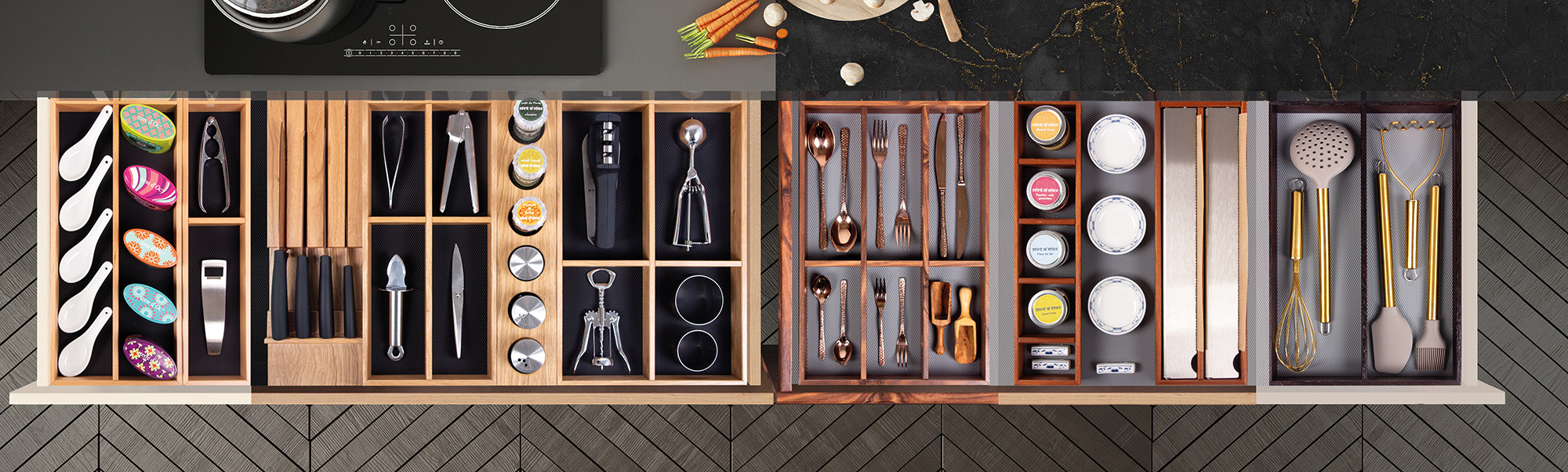 Entdecken Sie den Luxus perfekter Ordnung. Sie entscheiden über Größe, Zuschnitt und Einteilung Ihrer Einsätze. Sie können aus Besteckeinsätzen und Utensilien von über 30 Küchenmarken wählen: von Alno über Bulthaupt bis zu SieMatic. Sie können Ihre Einsätze auch nahezu komplett selbst konfigurieren. Wir benötigen nur Ihre Maße. Wie Sie richtig messen, erfahren Sie hier.