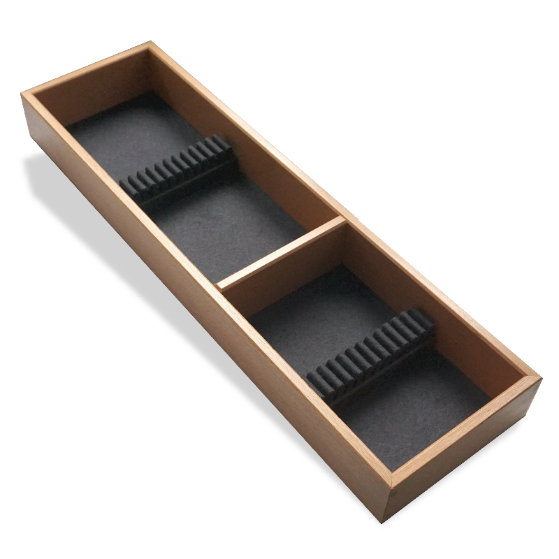 Besteckhalter-Element aus Holz mit Filzboden. Für die Lagerung von 2 x 12 Besteckteilen. Oben: 12 Speiselöffel- oder Gabeln. Unten: Kaffeelöffel- oder Kuchengabeln. Besteckbänkchen aus durchgefärbtem Kunststoff und Filz.